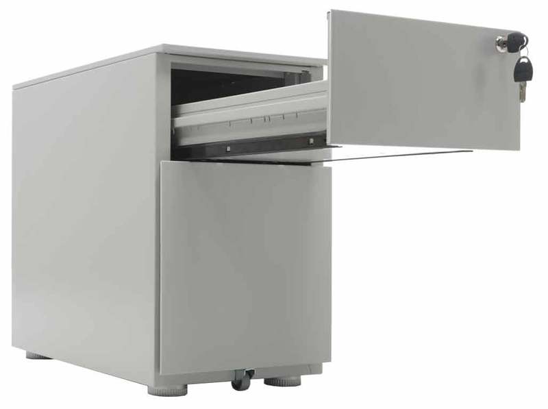 - Опции: пластиковые лотки и металлический ящик для канцелярских принадлежностей и других предметов. Возможность комбинирования цветов: корпус + фасады ящиков и крышка (конструкция тумбы металл+металл). Или отделка фасадов ящиков и крыши тумбы ламинированной плитой ЛДСП
